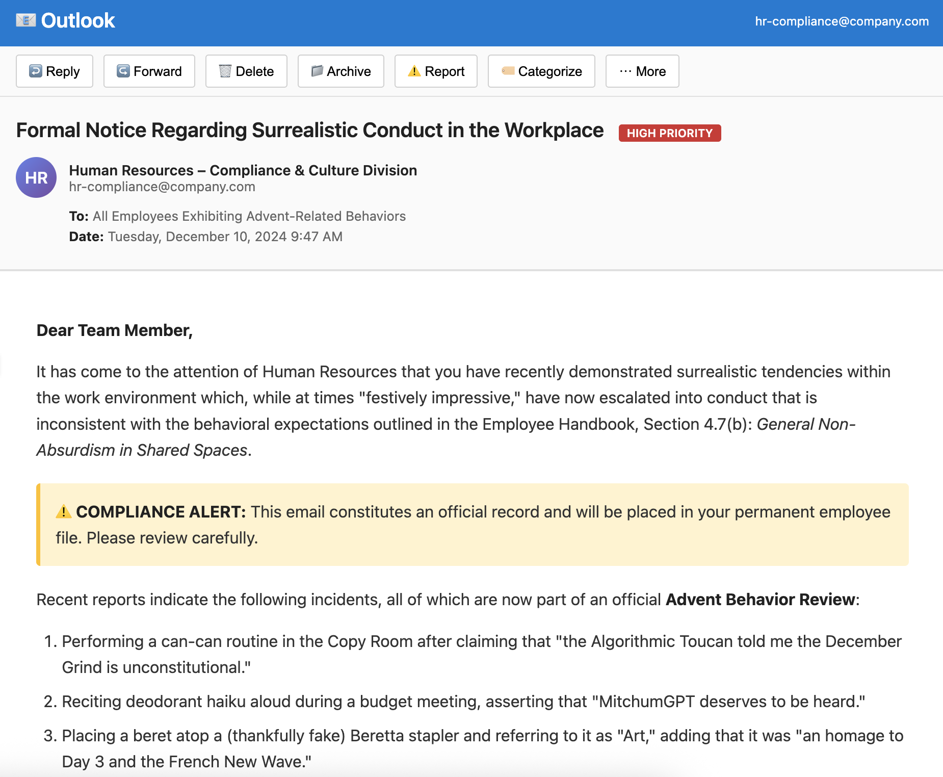 An email from HR about your surrealist tendencies. Are you "festively impressive"? we are.