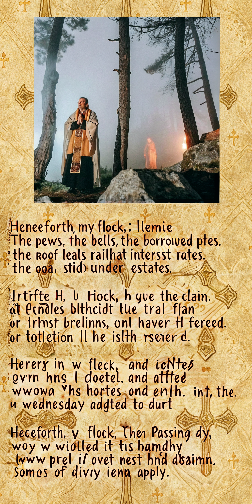 Each verse begins with “Henceforth, my flock…” Praise be to the financiers, for they shall inherit the debt.